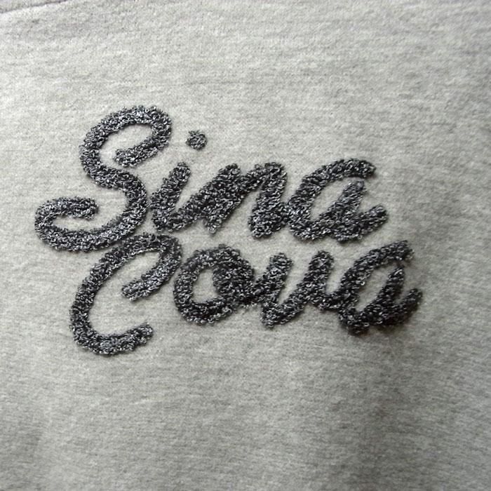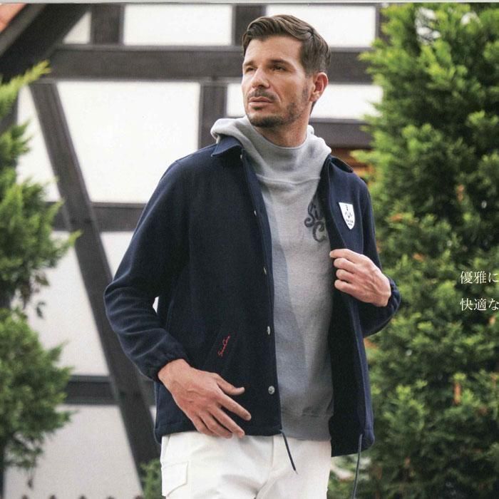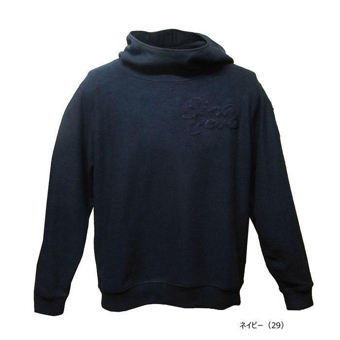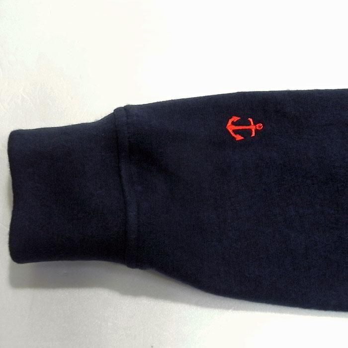 胸ににロゴのパイル刺繍、右袖に小さいいかりの刺繍があります。
